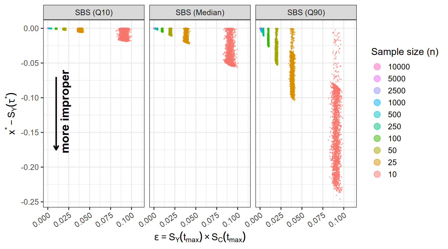 ann_df =data.frame(metric =unique(plot_data$metric)[1],x =0.01,y =-0.07,xend =0.01,yend =-0.175,label ="more improper")# shift vs epsilonset.seed(42)plot_data |>slice_sample(prop =0.2) |># 3 SBS metrics x 10 sample sizes (n) x 1000 simulations per nggplot(aes(x = epsilon, y = shift, color =factor(n))) +geom_point(alpha =0.5, size =0.1) +facet_wrap(~metric, scales ="fixed") +scale_color_discrete(name ="Sample size (n)",breaks =rev(sort(unique(plot_data$n))) # reverse legend ) +scale_x_continuous(limits =c(0, 0.11), breaks =c(0, 0.025, 0.05, 0.075, 0.1) ) +labs(x =expression(epsilon == S[Y](t[max]) %*% S[C](t[max])),y =expression(x^"*"- S[Y](tau^"*")), # shift from optimal predictioncolor ="Sample size (n)" ) +theme_bw(base_size =14, base_family ="Arial") +theme(axis.text.x =element_text(angle =35, hjust =1)) +guides(color =guide_legend(override.aes =list(size =4))) +geom_segment(data = ann_df,aes(x = x, y = y, xend = xend, yend = yend),inherit.aes =FALSE,linewidth =1,arrow =arrow(length =unit(0.25, "cm")) ) +geom_text(data = ann_df,aes(x = x +0.01, y = y -0.05, label = label),inherit.aes =FALSE,angle =90,size =6,fontface ="bold" )